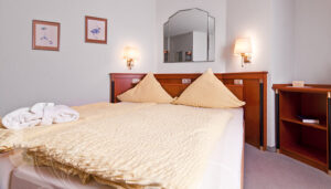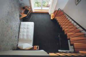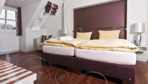 Durch den Eingang betritt der Gast ein lichtdurchflutetes Foyer, das im Erschließungsbereich das Thema Klinker fortführt. Ein wunderschön angelegter, bis auf die Kellersohle abgetreppter Garten auf der rückwärtigen Gebäudeseite wird durch große Fensterflächen vor dem Tagungsbereich und den zum garten ausgerichteten Zimmern erlebbar. „Die Vorbereiche zu den Tagungsräumen und die Zimmer sind auf Lerngruppen von zwei bis drei Personen ausgerichtet. Daher sind überall kleine Besprechungszonen vorgesehen. Besonderen Anklang finden die Maisionetten-Zimmer, in denen bis zu drei Personen ungestört arbeiten und schlafen können“, weiß der Hausherr zu berichten. Auch Innovationen in dem von privaten Gästen genutzten Bereich haben es ihm angetan, so bietet beispielsweise der Turm zwei liebevoll eingerichtete Hochzeitszimmer.