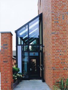 Architekt Reuschenbach wurde wieder beauftragt und konnte unter Beweis stellen, dass er mit den Gegebenheiten bestens vertraut war. Er wählte einen L-förmigen Grundriss, der der Lage an der Einmündung zur Hauptstraße Rechnung trägt. Das Gelenk bildet ein dreigeschossiger, quadratischer Turm mit Zeltdach, der in direktem Bezug zum Stammhaus steht. Daran schließen sich zu beiden Seiten niedriegere, weitgehend geschlossen gehaltene Gebäudeflügel an, die den Verlauf der früheren Stallungen aufnehmen. Im wahrsten Sinne hervorragend ist der Eingang, der als kleiner Glasvorbau im Kontrast zu den homogenen Klinkervolumina steht. Eine massive Stützenreihe führt auf den Eingang zu, wird in die Glaswand integriert und läuft weiter auf die Klinkerwand des Seitenflügels. Dort wirken die Stützen vor gleich großen Fenstern in der Wand, als ob sie aus der massiven Mauer herausgestanzt seien. Der Architekt erläutert: „Das Herausschwenken der Stützenreihe ist für den Ankommenden in doppelter Weise erlebbar. Zunächst wird er, wenn er in den Ort hineinkommt, die parallel zur Straße erstellte Stützenreihe als strigente Wegführung zur Ortsmitte hin, nämlich zum Stammhaus erfahren.“ Die Bauabsicht mit unterschiedlichen Gebäudekörpern und -verschränkungen hat der Bürgermeister in seiner Eröffnungsrede auf den Punkt gebracht: Er habe „…den Ort wiedererkannt, ohne die Architektur der Stallungen zu sehen.“